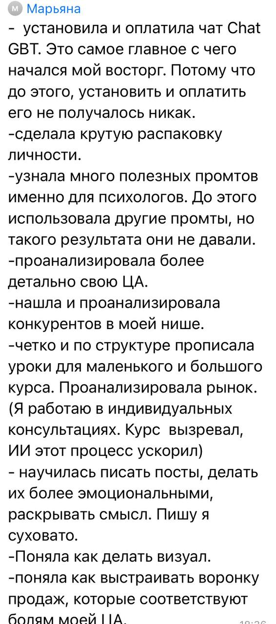 Вы не просто психолог. Вы — творец изменений, который работает на передовой человеческого разума. Так почему бы не использовать для этого возможности искусственного интеллекта? Забудьте скучные лекции по маркетингу, я меняю правила игры. Сосредоточьтесь на своей практике, пока нейронки работает за вас.
